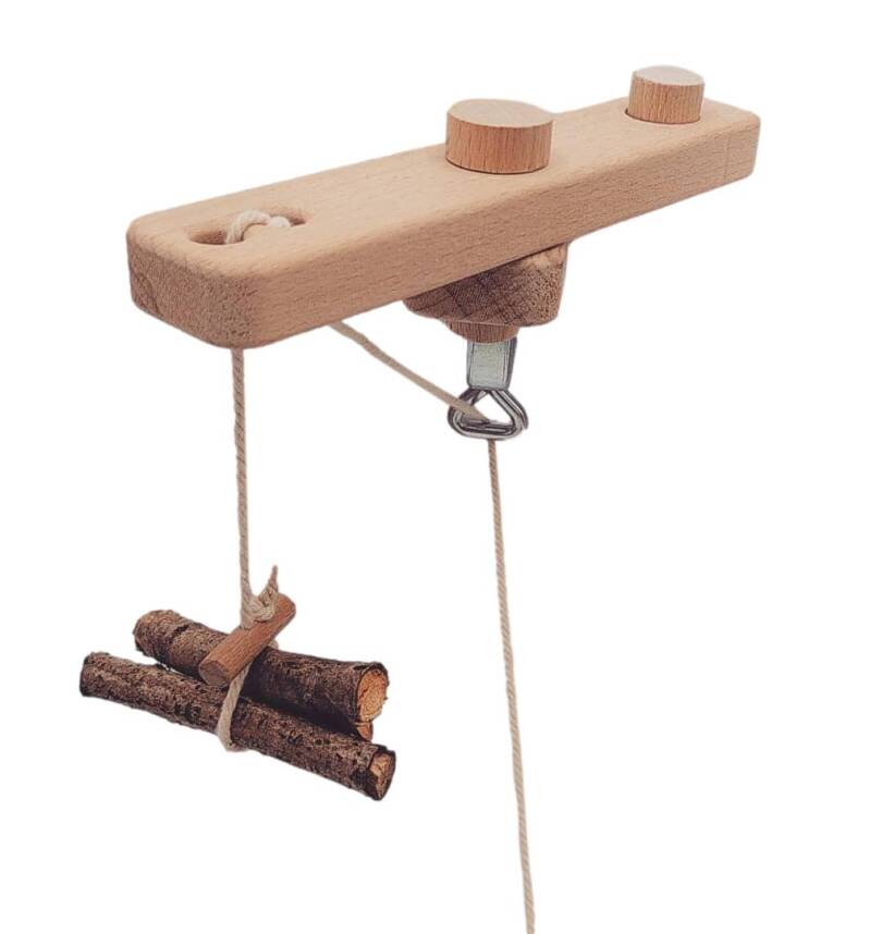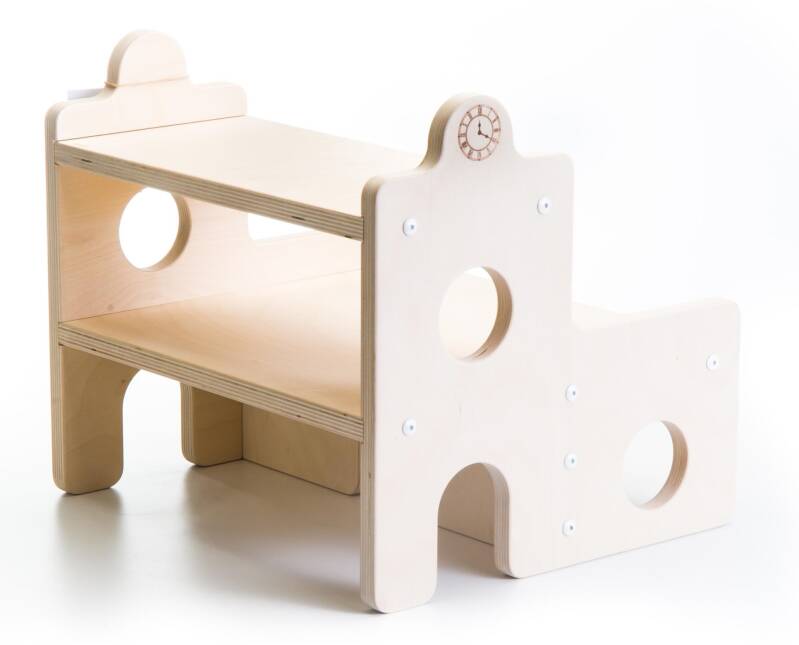 Sebastiaan kijkt met grote ogen toe op het moment dat de kruk een speelgoed kasteel wordt. Zijn nieuwsgierigheid en fantasie maken van Speelkruk Sebastiaan een kasteel of een spoorbrug. Door de schuifdelen er in- en uit te halen ontstaan er telkens nieuwe vormen die uitdagen tot spelen. Houten Speelkruk Sebastiaan is bedoeld als ingrediënt voor fantasievol spel.